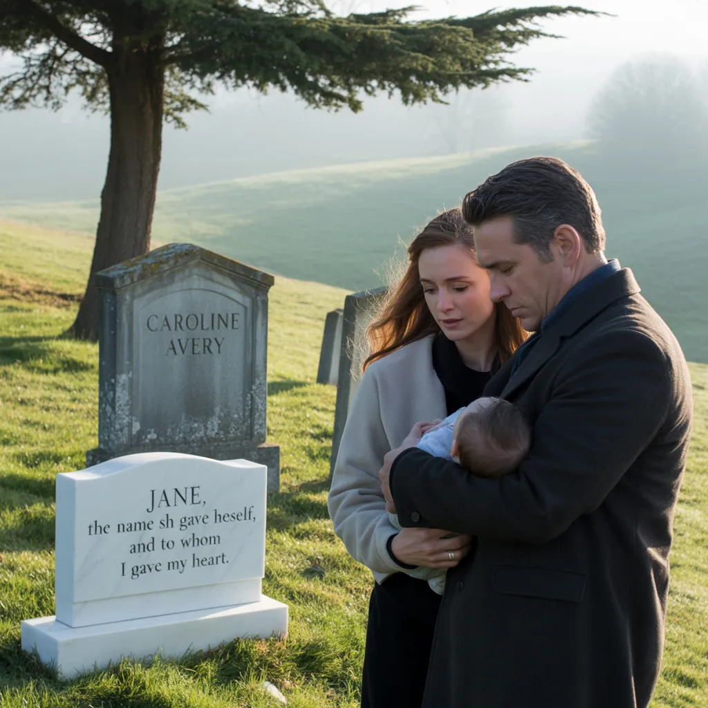 She watched him hold the baby, not stiffly, not cautiously, but with the familiarity of someone who’d learned to carry something precious, without fear of dropping it. Then she saw it. Beside Caroline’s stone, the earth had been freshly turned, but it wasn’t a grave. It was a marker, smooth, white, unweathered, and carved into the stone were the words, “Jane, the name she gave herself, and I gave my heart to.” Her breath stopped.