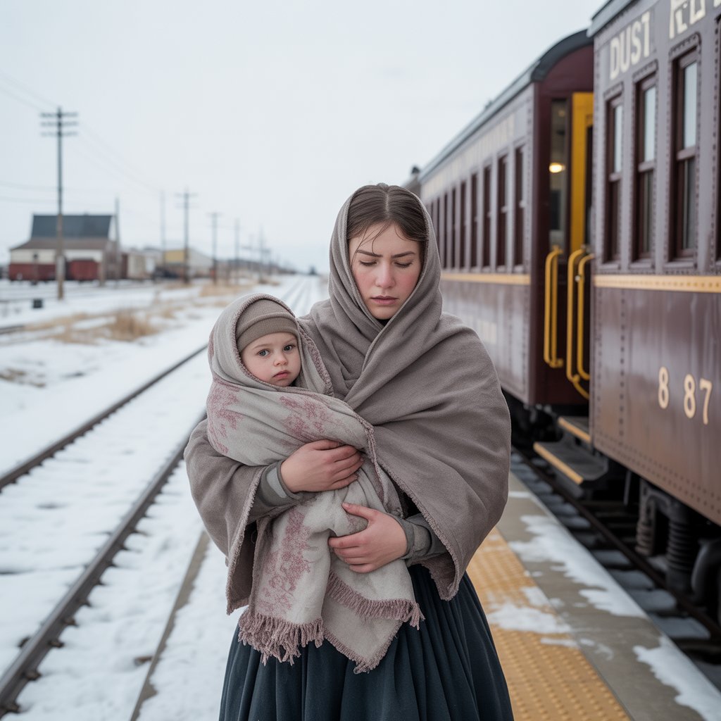 She was left at the train station with a baby and no name until the silent cowboy said, “You do now.” Dust Creek, Wyoming Territory, Winter, 1887. The wind screamed down the tracks, carrying flurries of snow and the scent of iron. The last evening train pulled away, leaving behind a trail of white steam and a single figure standing alone on the frozen platform.